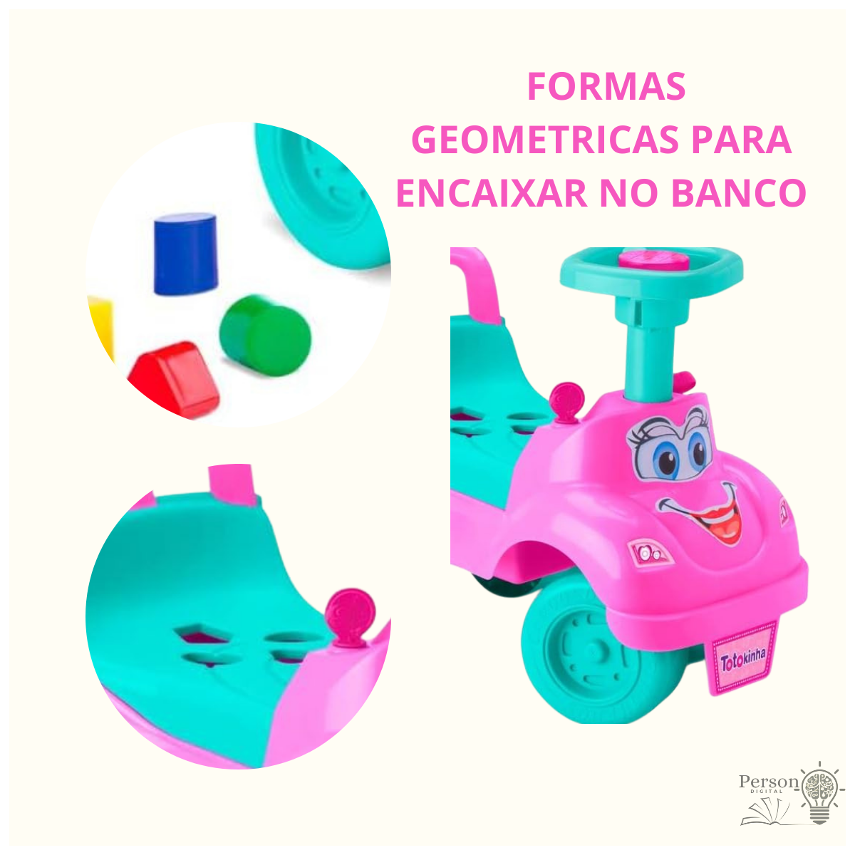 Os diferenciais da Totokinha estimulam a coordenação motora do bebê proporcionam a brincadeira de encaixe das formas geométricas além de estimular os primeiros passos e equilíbrio do bebê