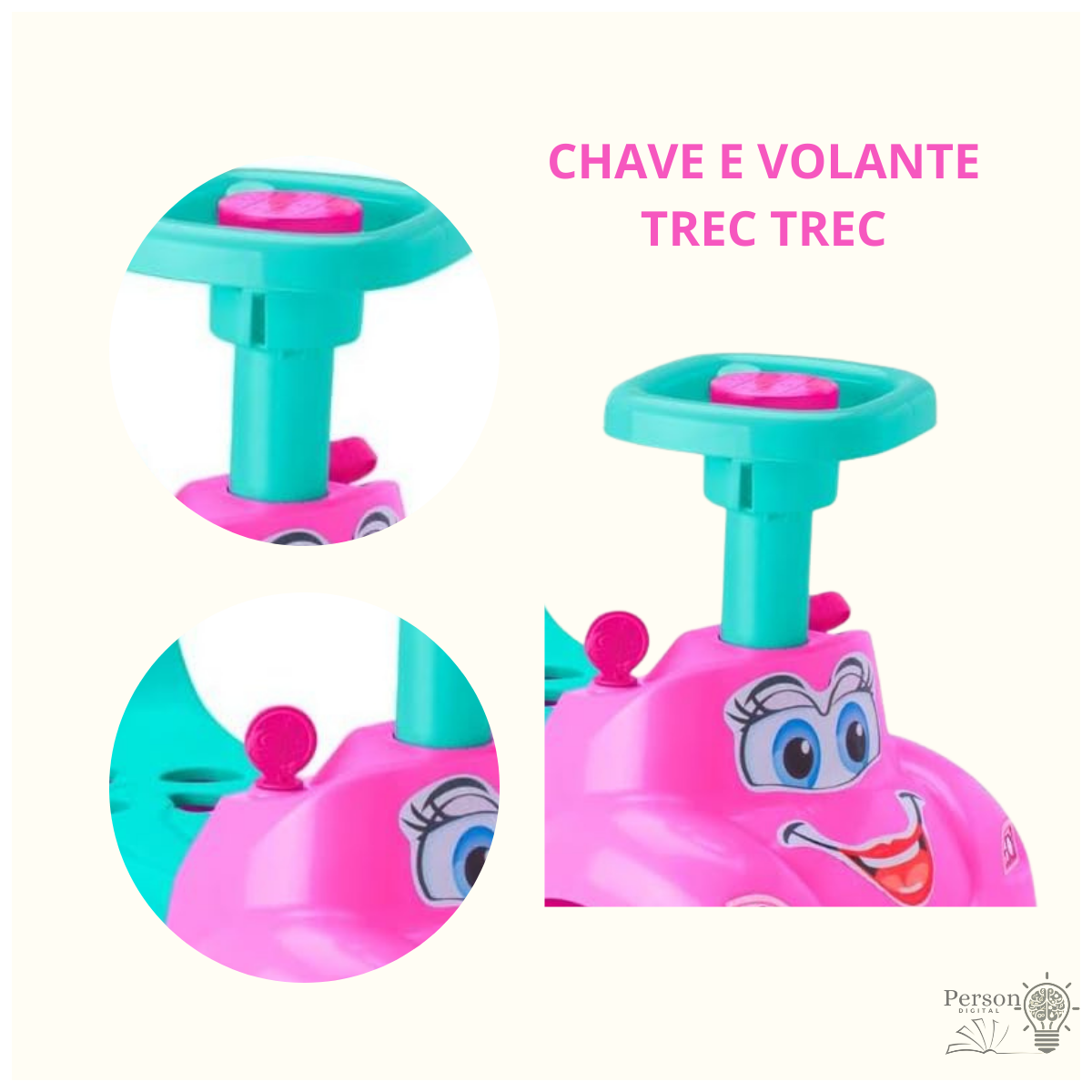 A Totokinha possui buzina que faz bibi marcha e chave com som de creccrec portamalas que abre e fecha e banco com encaixe de peças geométricas Além de vir com 4 formas geométricas